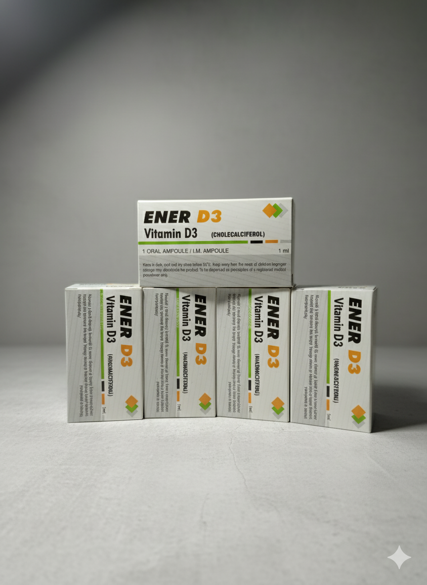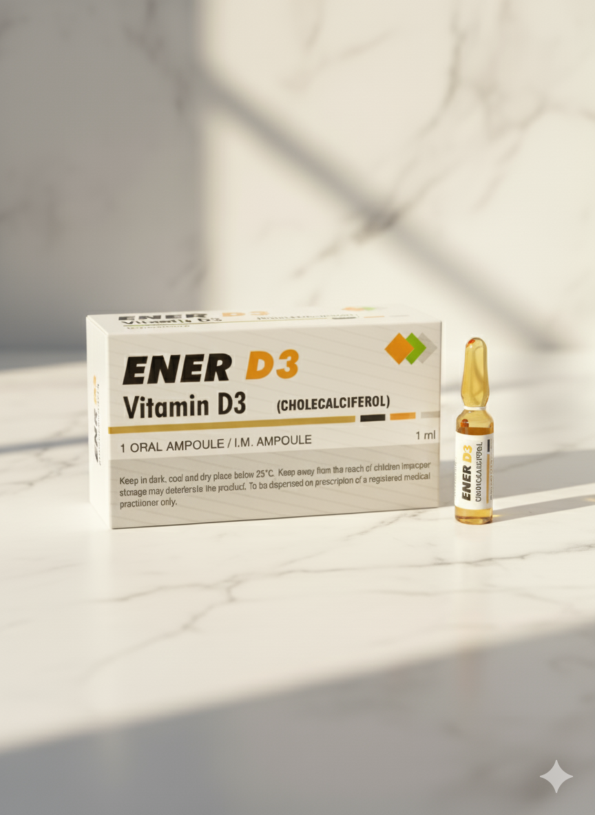 ENER D3 is a premium Vitamin D3 (Cholecalciferol) injection designed to restore and maintain optimal Vitamin D levels—essential for bone health, calcium absorption, and immune defense. Each 1 ml ampoule delivers a powerful, doctor-recommended dose of pure Cholecalciferol that supports faster recovery from Vitamin D deficiency and promotes overall well-being.