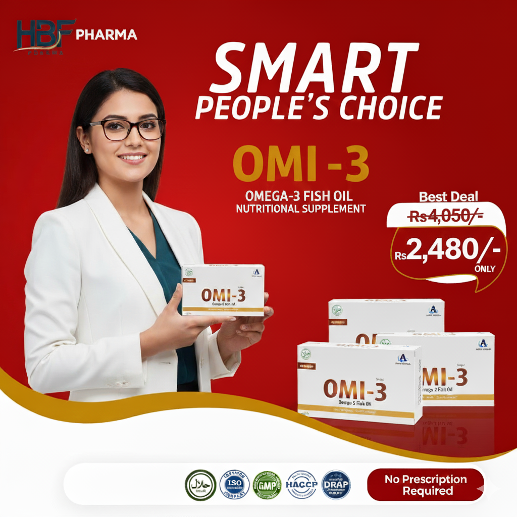 Fuel your daily wellness with OMI-3, a premium Omega-3 Fish Oil softgel formulated to support heart health, brain function, and joint mobility. Each halal-certified capsule delivers high-quality Omega-3 fatty acids (EPA & DHA) that help maintain healthy cholesterol levels, reduce inflammation, and boost mental clarity — the essential nutrients your body can’t make on its own.